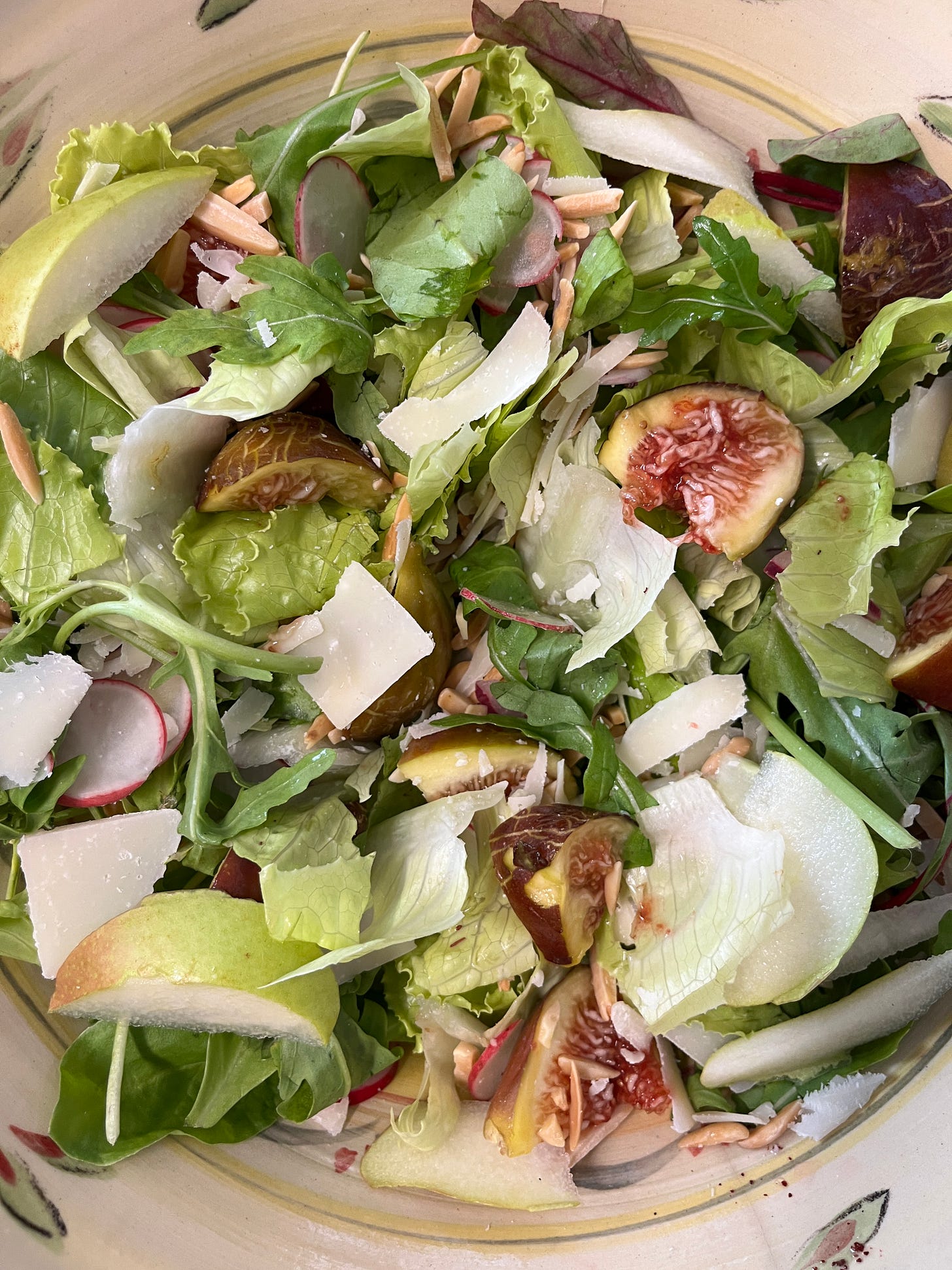Welcome to the (near) end of the newsletter, where you are rewarded with a yummy recipe. We have two newish restaurants in Modiin with the word “fig” in them; I’ve been to both recently for some delicious salads, pizza, and other dairy appetizers. I decided to recreate my favorite salad at home, with some additions. Adjust quantities according to how many people are eating it…This is the one I just made for my daughter and myself.
