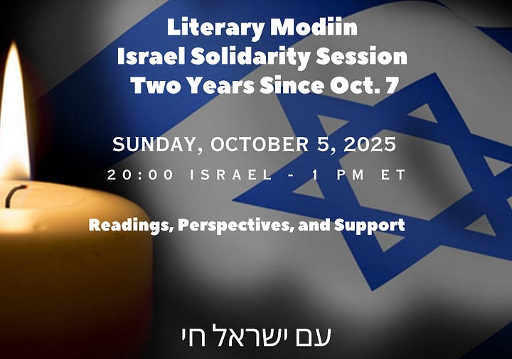 Literary Modiin is taking vacation in August, but we’ll be back in early September with another all-star event, followed by a solidarity event in October to commemorate two years since October 7th.